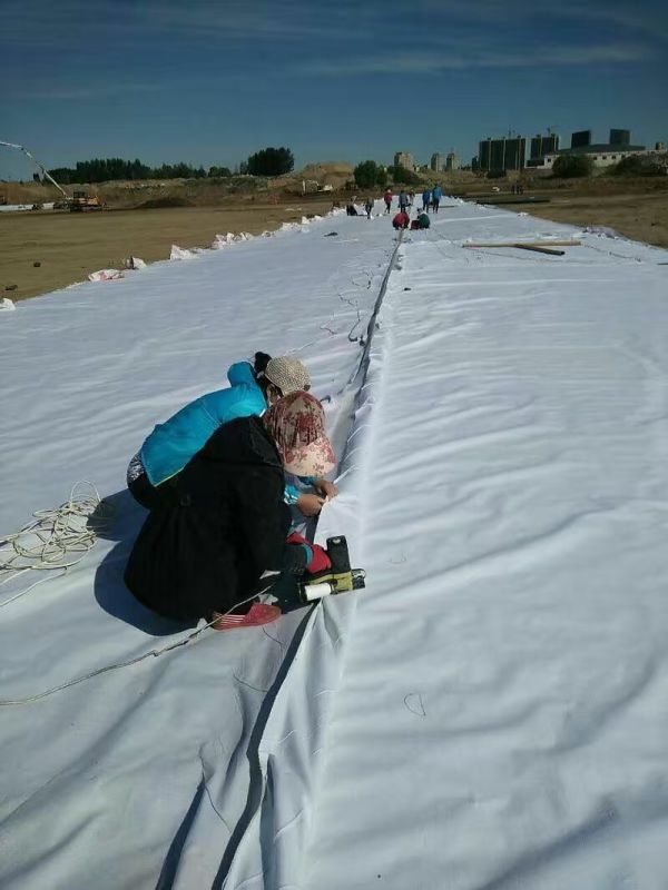 3、為保證質(zhì)量,盡量采用寬幅復(fù)合土工膜以減少現(xiàn)場(chǎng)拼接,需要剪裁的在完成后卷在鋼管上,人工搬運(yùn)到工作面。